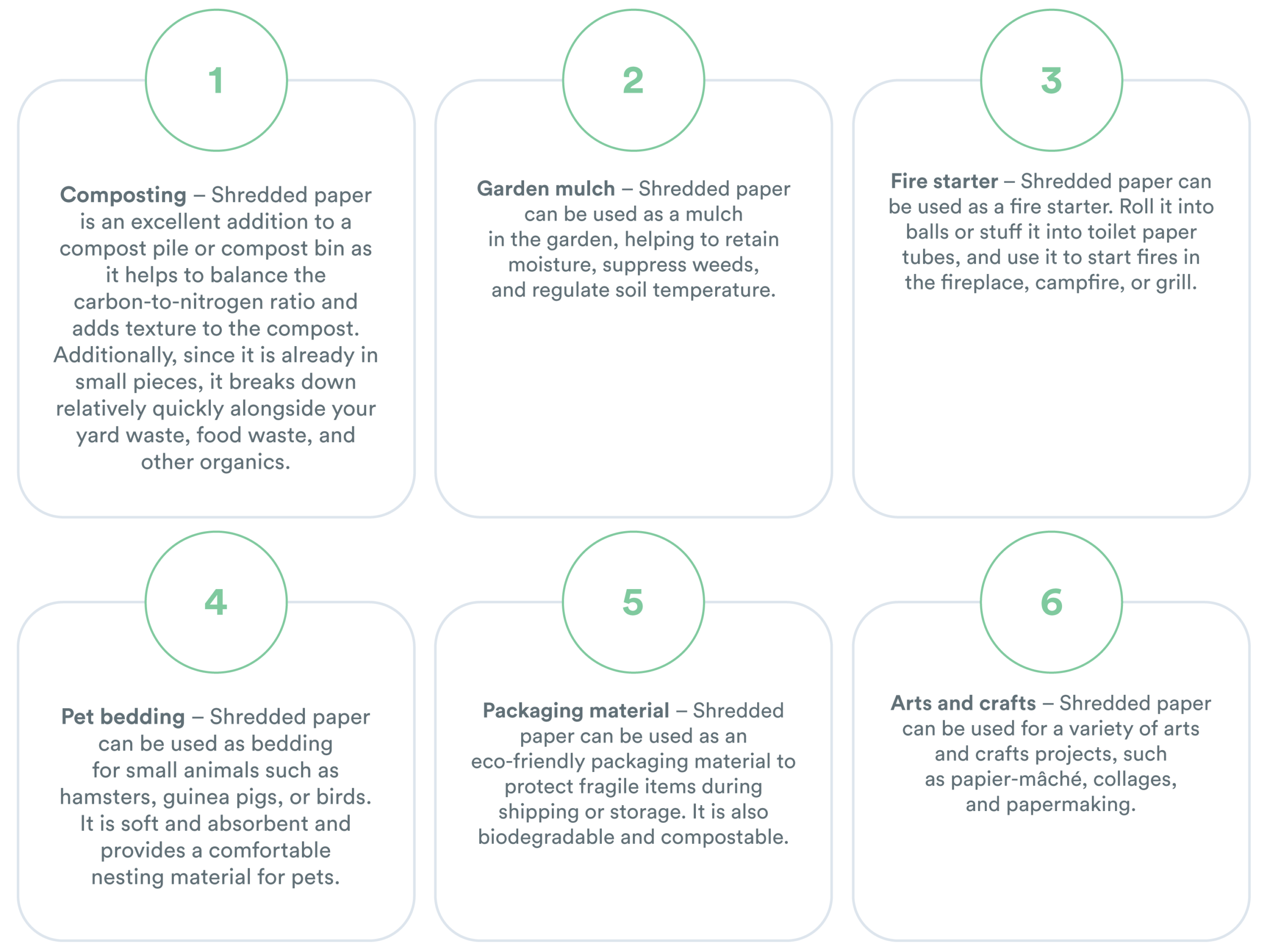 كما هو الحال مع جميع المنتجات الورقية، تتيح لنا إعادة تدوير الورق المقطّع الإبقاء على المواد في الحلقة، بدلاً من إرسالها إلى مكب النفايات حيث تتسبب في مشاكل متعددة. يمكن إعادة استخدام الورق المقطّع الذي تمت إعادة تدويره كمنتجات ورقية جديدة، على الرغم من أن هذه المنتجات عادةً ما تكون أقل جودة من المواد الأصلية حيث تتحلل ألياف الورق بعد المعالجة.