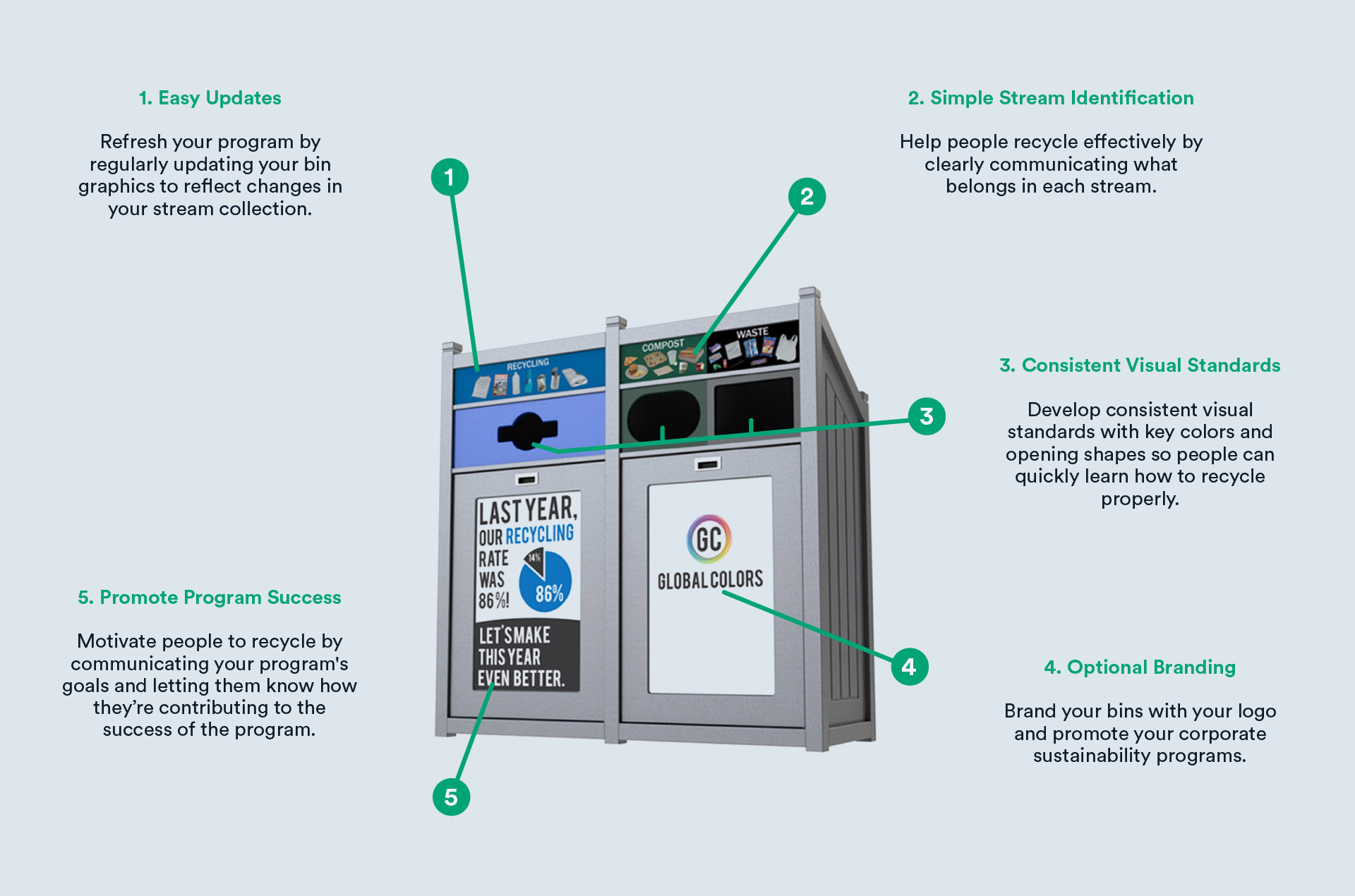 Brand your bins with your logo and promote your corporate sustainability programs.
