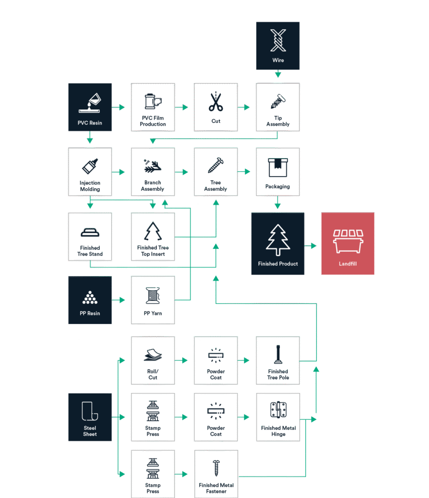 Artificial Christmas trees are primarily made from steel sheets, polyvinyl chloride (PVC), a non-recyclable, biodegradable, petroleum-derived plastic, and polypropylene (PP). PVC is a known carcinogen and can be harmful to humans. These raw materials go through the processing and production steps that result in an artificial tree and tree stand. First, the PVC film produced from the PVC resin undergoes cutting and is combined with a steel wire to form the branches. Next, PP yarn produced from PP resin is then attached to the tip of the branches to complete branch assembly. The steel sheets undergo a rolling and cutting process to form the tree pole and the treetop insert is made from PVC resin. The steel sheets are also stamp pressed and powder coated using epoxy resin to form metal hinges. The tree is then packaged in a cardboard box and sealed using plastic tape. Overall, during the manufacturing process of an artificial Christmas tree, resources, such as electricity, thermal energy, gas, and water, are all used.