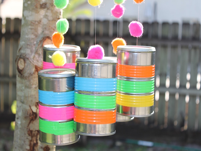 Deja que el viento haga su trabajo y disfruta de los sonidos de las campanas de viento caseras de tu hijo. O deja que tu hijo haga más ruido y cree su propia banda de rock con las latas rellenas.