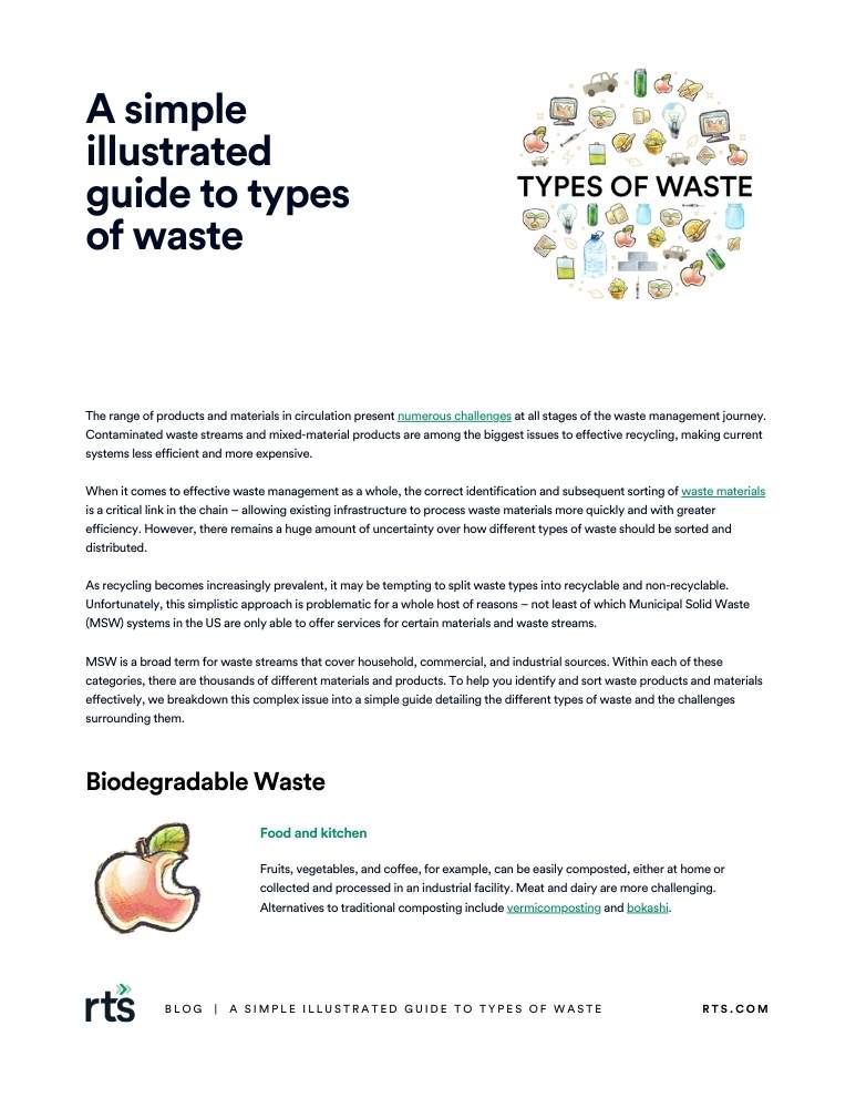 Para obtener más información sobre cómo su empresa puede identificar y clasificar mejor los flujos de residuos, aplicar prácticas eficaces de gestión de residuos y aumentar el reciclaje y el compostaje, lea la Guía de gestión de residuos de RTS o póngase en contacto con un miembro de nuestro equipo hoy mismo.