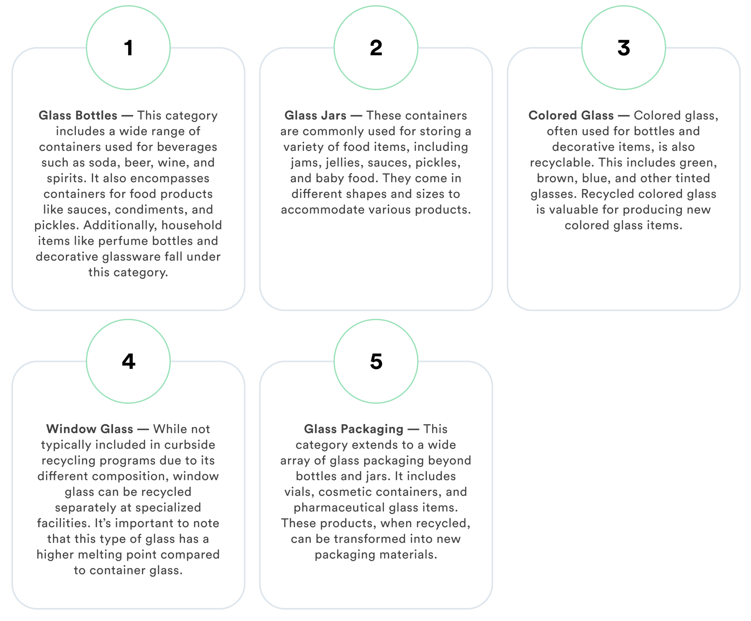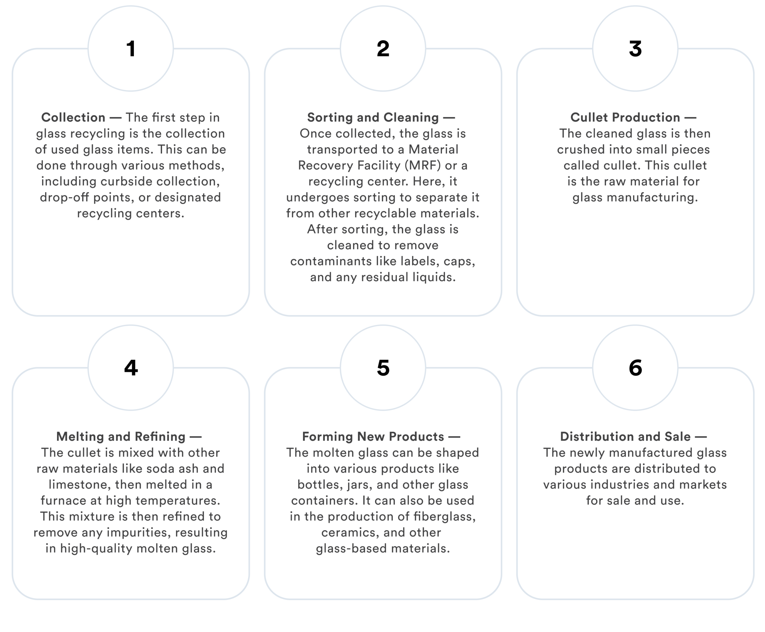 Le recyclage moderne du verre implique la collecte, le traitement et la transformation des objets en verre usagés en nouveaux produitsen conservant matières premièresla réduction de la consommation d'énergie et des émissions de gaz à effet de serre. à effet de serre associées aux nouveaux produits. Dans la plupart des cas, le recyclage du verre suit ces étapes :