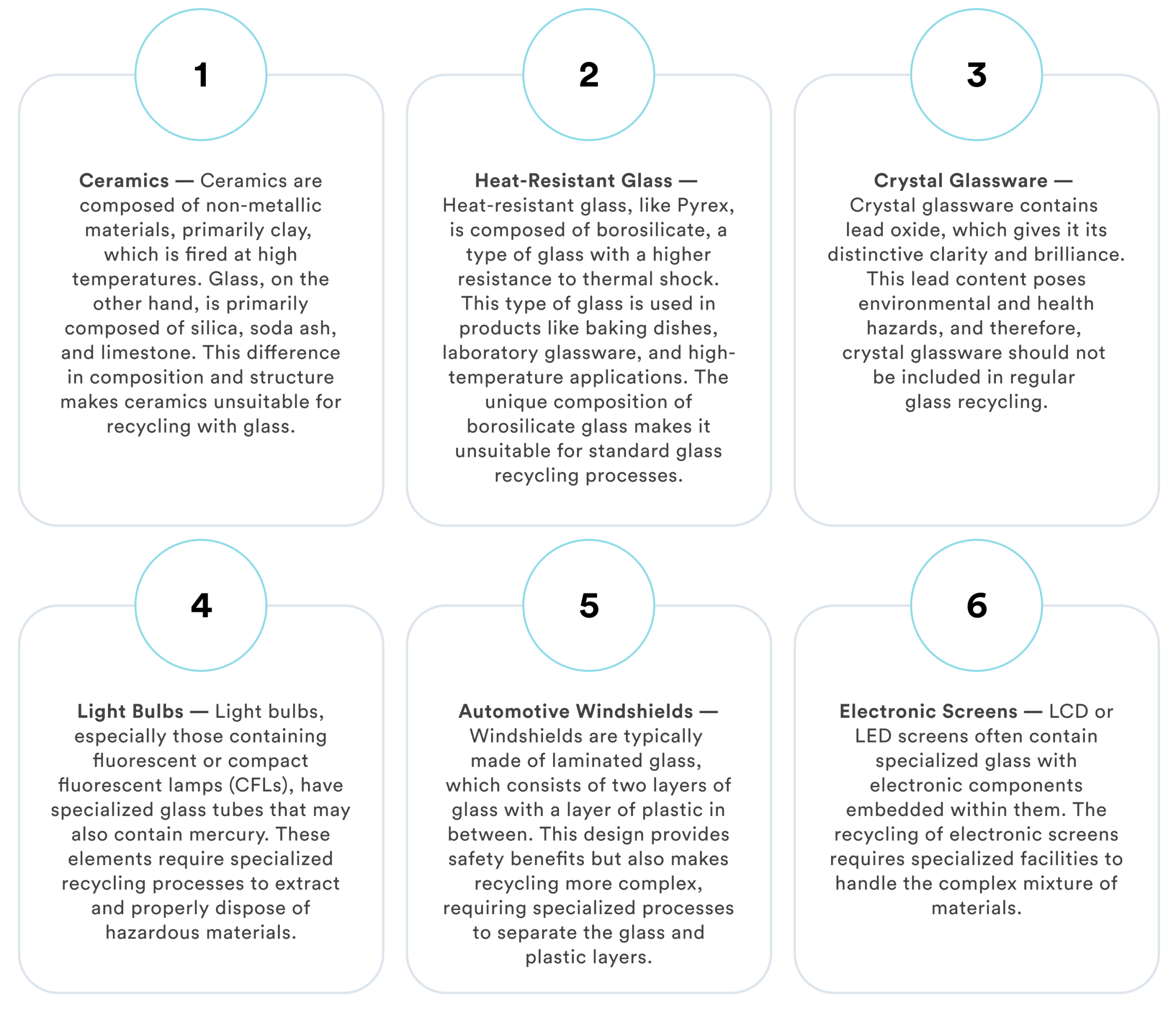 Malheureusement, tout le verre n'est pas recyclable, et les articles à base de verre tels que les suivants ne doivent pas être ajoutés aux bacs de recyclage: