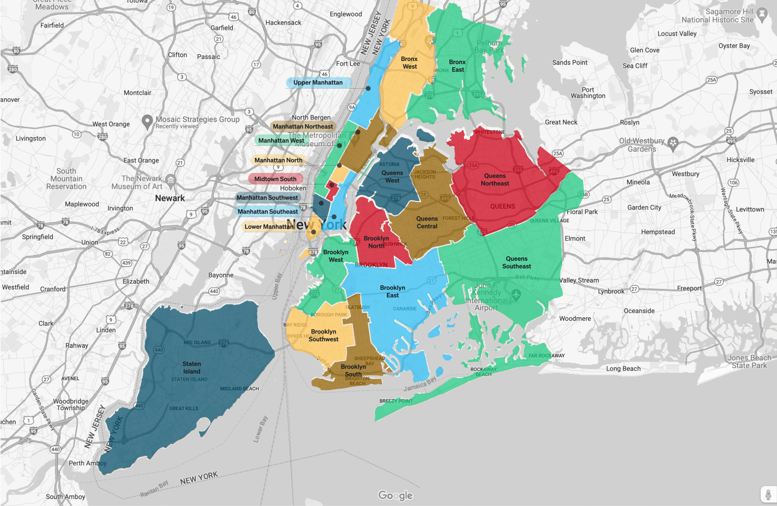 Les zones ont été définies par le DNYC, et nous avons inclus la carte et une liste des zones dans chaque arrondissement ci-dessous à titre de référence.